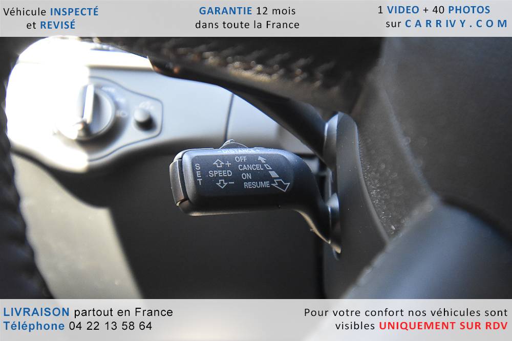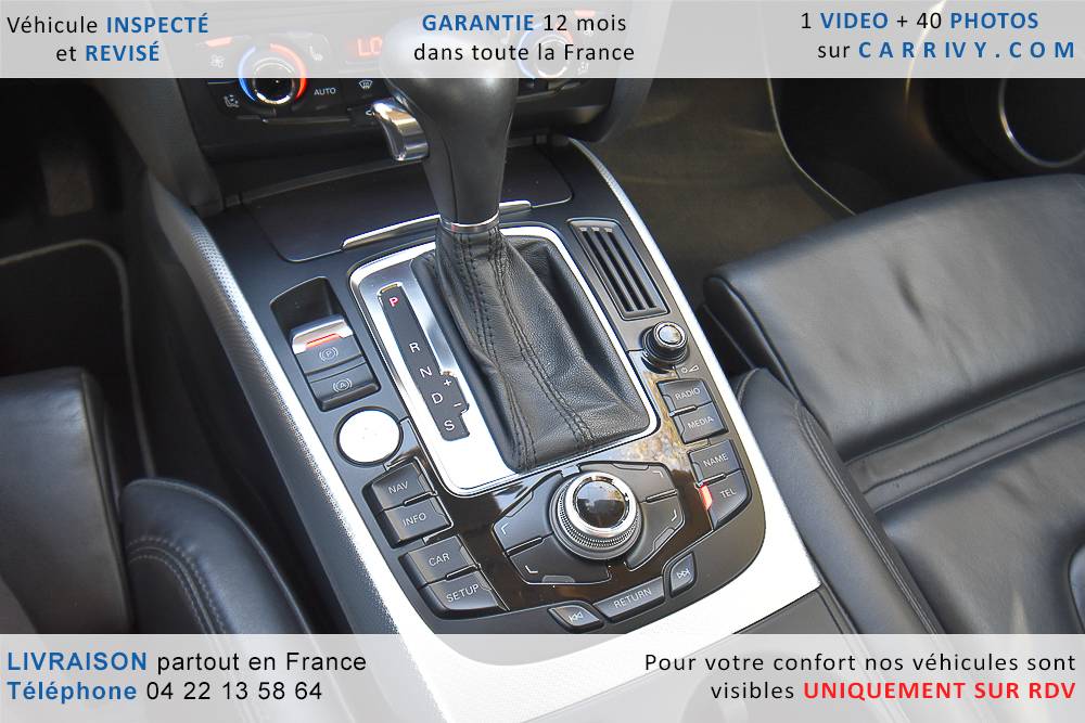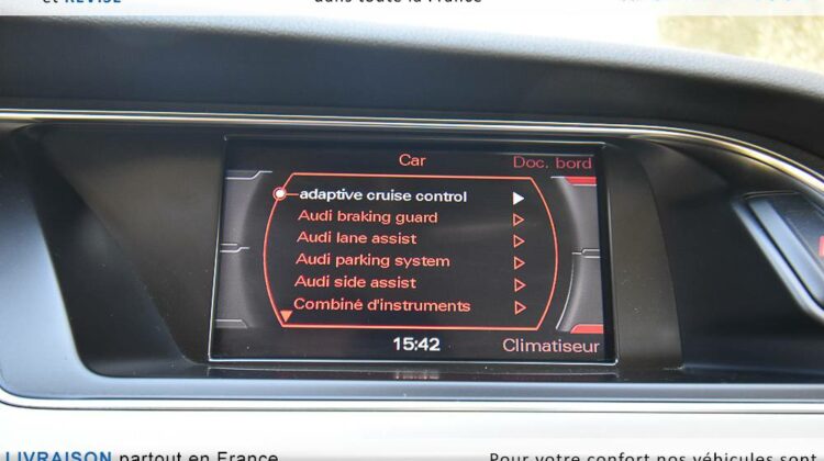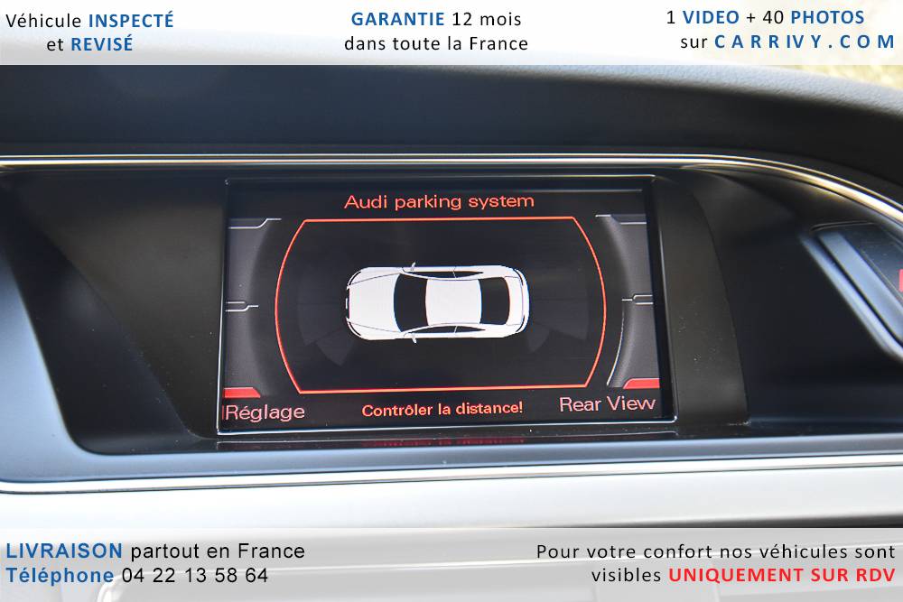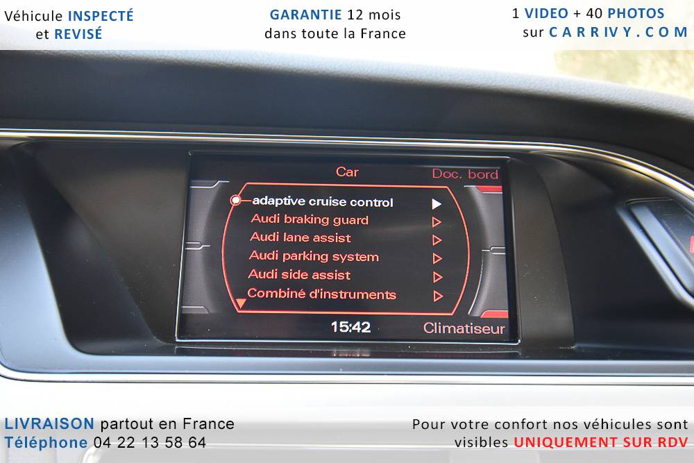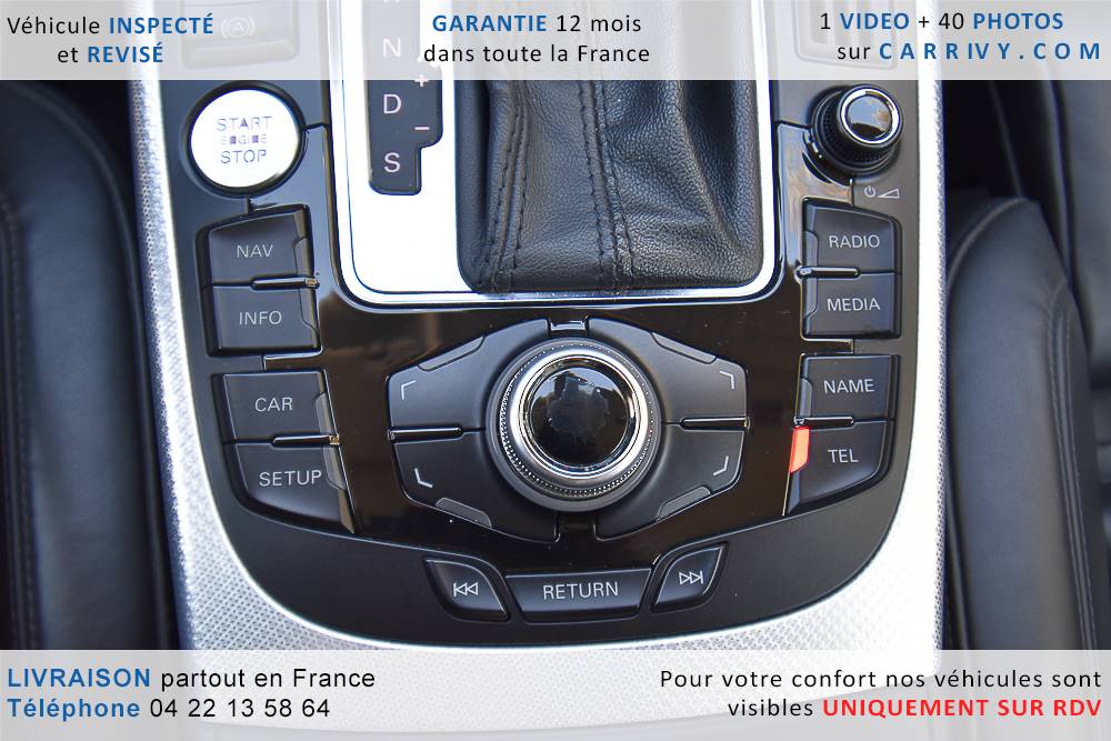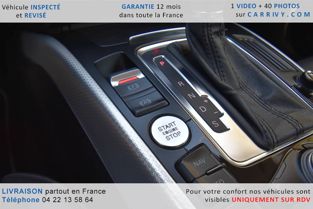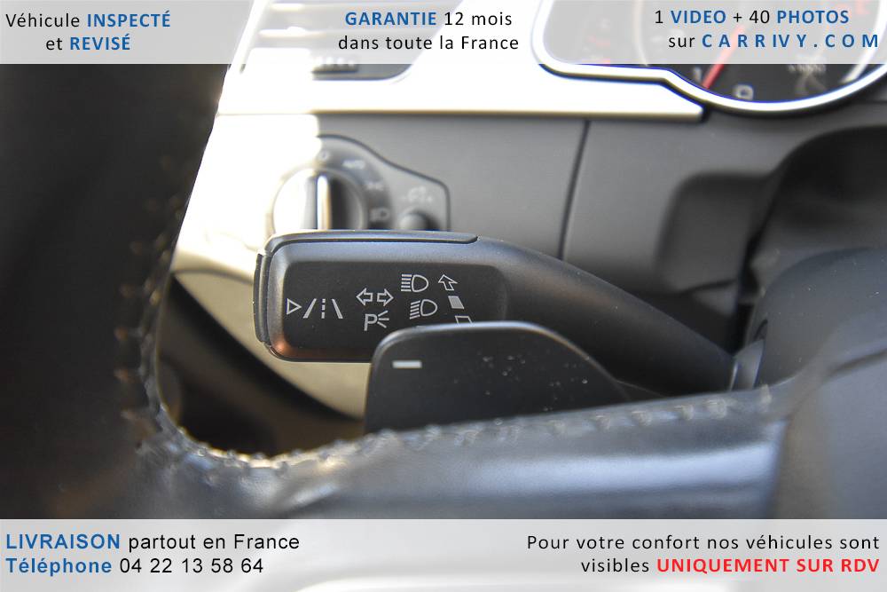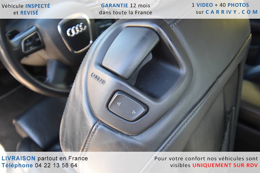 EQUIPEMENTS => Gps tv + carte sd – Kit mains libres bluetooth – Radio cd mp3 + chargeur cd – Capteur de pluie et de luminosité – Régulateur de vitesse – Jantes alu – Phares bi xénon – Radar de recul – Rétroviseurs électriques – Banquette 1/3 2/3 – Clim automatique tri zones – Direction assistée – Ordinateur de bord – Rétroviseur intérieur électrochrome – Sièges avant électriques – Verrouillage centralisé des portes – Vitres avant électriques – Volant réglable en profondeur et hauteur – Sellerie cuir – Abs – Airbags frontaux – Airbags latéraux avant – Airbags rideaux – Antipatinage – Esp – Phares antibrouillard – Démarrage sans clé : 710 € ttc – Régulateur de vitesse et de distance : 1 180 € ttc – Caméra de recul : 960 € ttc – Peinture métal : 890 € ttc – Radar de stationnement av et ar : 430 € ttc – Rétros élec. dégivrants et rabattables : 410 € ttc – Sièges avant chauffants : 380 € ttc – Sellerie cuir & alcantara : 380 € ttc – – Suivi d’entretien audi en intégralité – Première main – Interieur cuir – Sièges chauffants – Détecteur de franchissement – Front assist – Réglage électrique des sièges à mémoire : 1500 – Détecteur d’angle mort – Hifi bang & olufsen : 1500 –