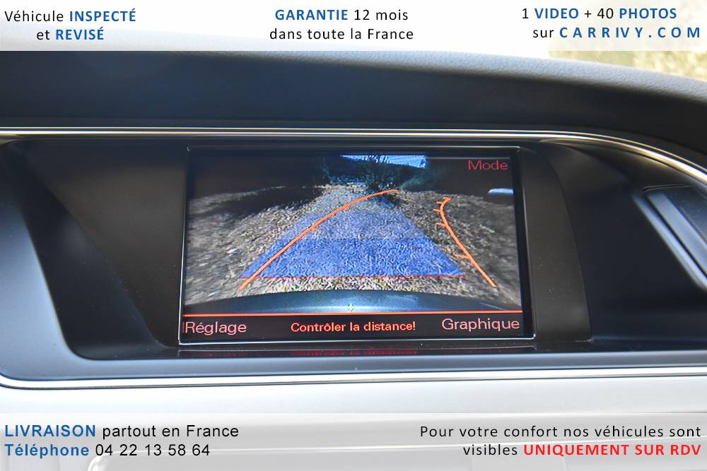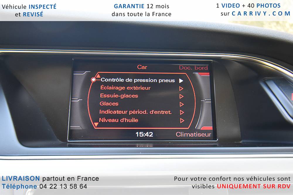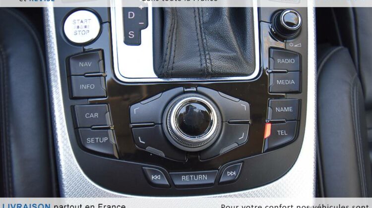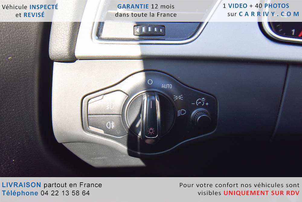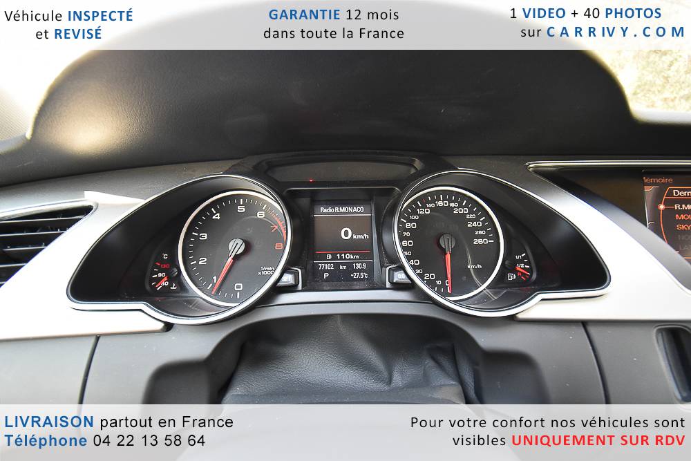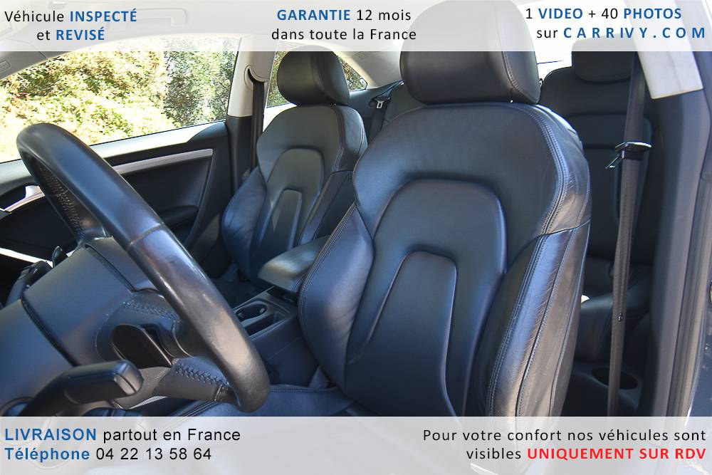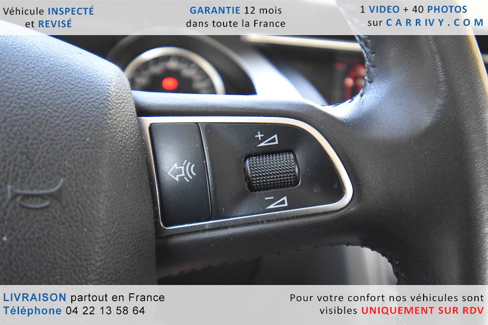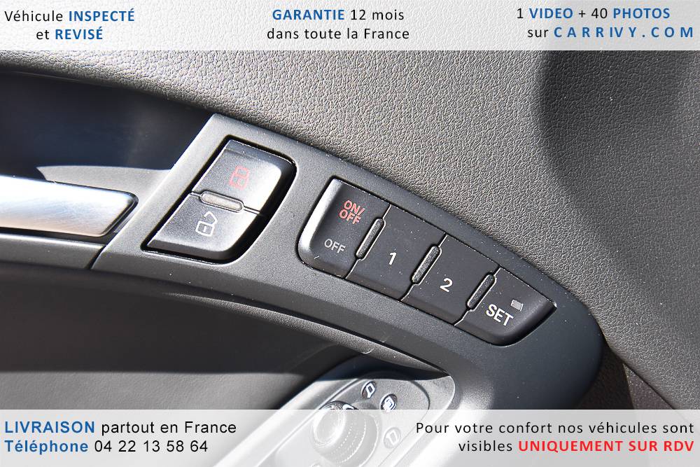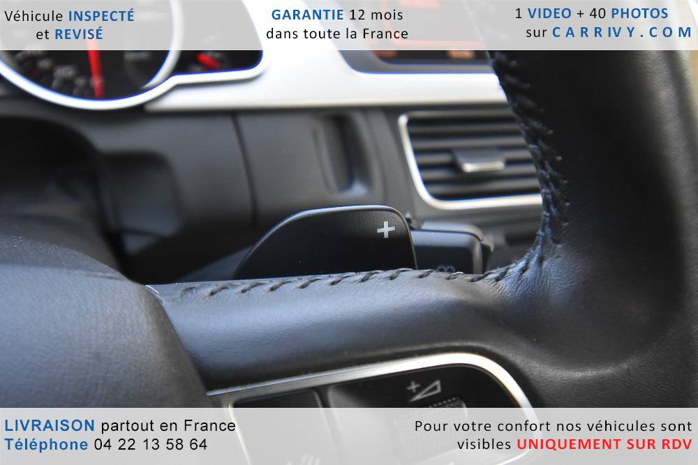 EQUIPEMENTS => Gps tv + carte sd – Kit mains libres bluetooth – Radio cd mp3 + chargeur cd – Capteur de pluie et de luminosité – Régulateur de vitesse – Jantes alu – Phares bi xénon – Radar de recul – Rétroviseurs électriques – Banquette 1/3 2/3 – Clim automatique tri zones – Direction assistée – Ordinateur de bord – Rétroviseur intérieur électrochrome – Sièges avant électriques – Verrouillage centralisé des portes – Vitres avant électriques – Volant réglable en profondeur et hauteur – Sellerie cuir – Abs – Airbags frontaux – Airbags latéraux avant – Airbags rideaux – Antipatinage – Esp – Phares antibrouillard – Démarrage sans clé : 710 € ttc – Régulateur de vitesse et de distance : 1 180 € ttc – Caméra de recul : 960 € ttc – Peinture métal : 890 € ttc – Radar de stationnement av et ar : 430 € ttc – Rétros élec. dégivrants et rabattables : 410 € ttc – Sièges avant chauffants : 380 € ttc – Sellerie cuir & alcantara : 380 € ttc – – Suivi d’entretien audi en intégralité – Première main – Interieur cuir – Sièges chauffants – Détecteur de franchissement – Front assist – Réglage électrique des sièges à mémoire : 1500 – Détecteur d’angle mort – Hifi bang & olufsen : 1500 –