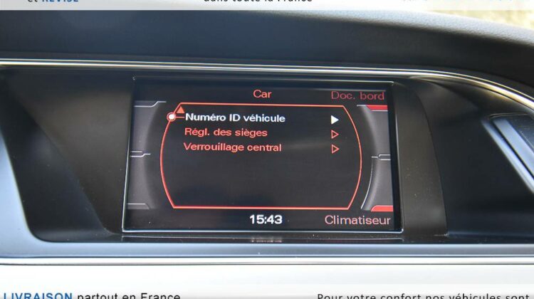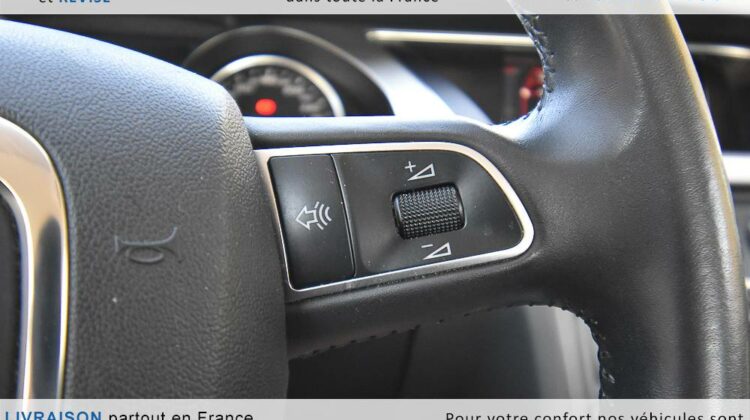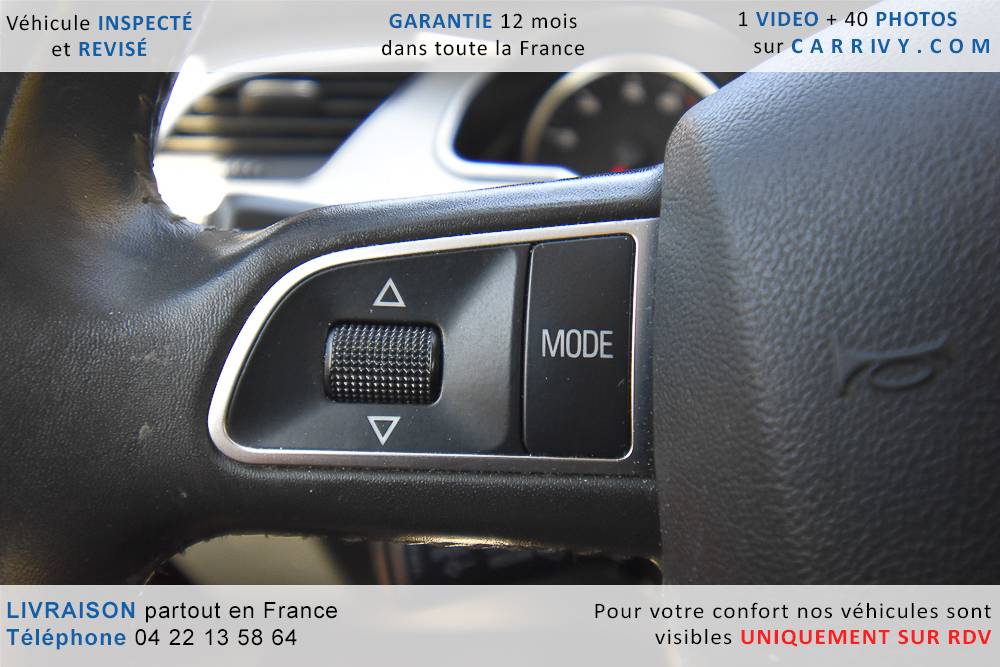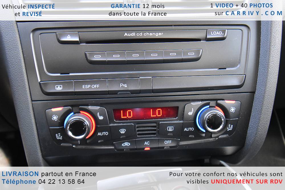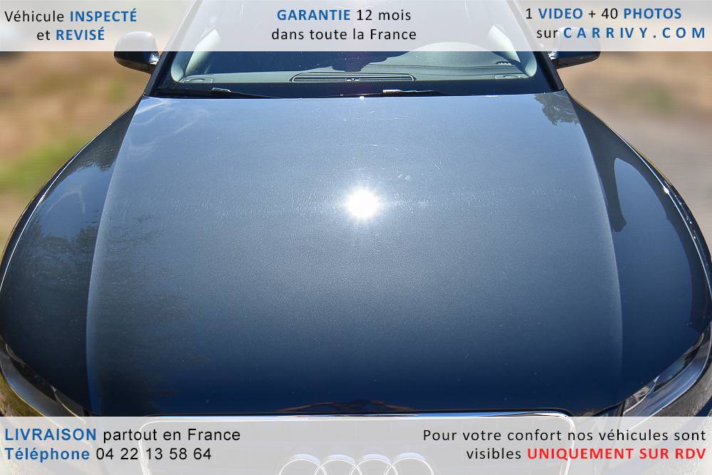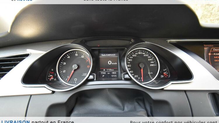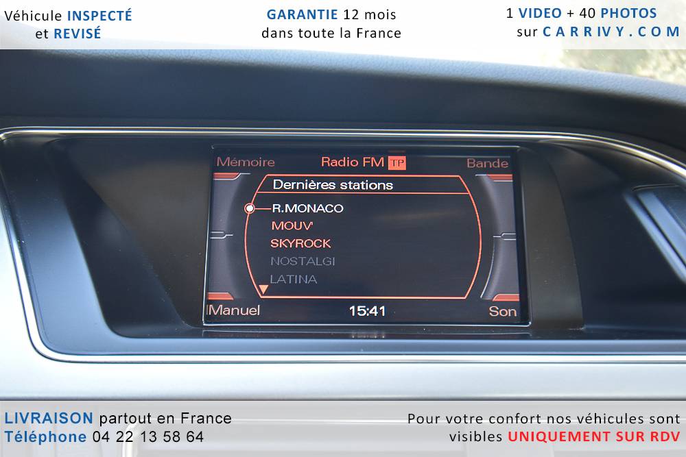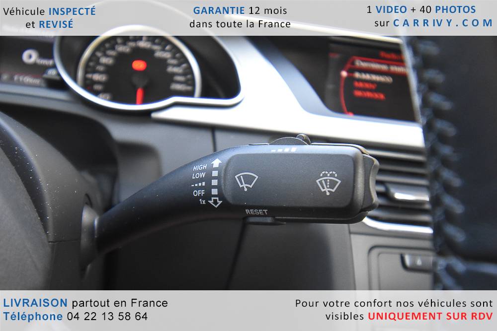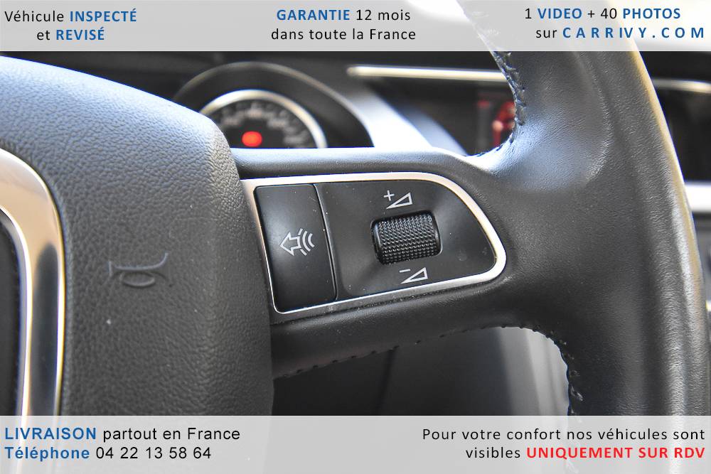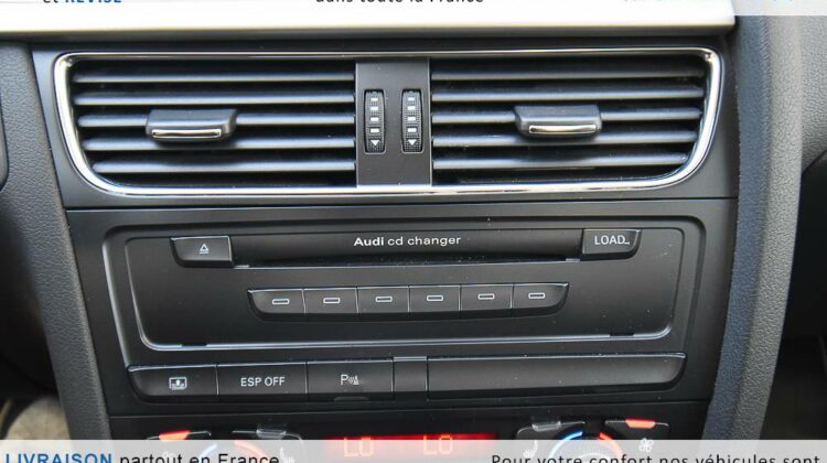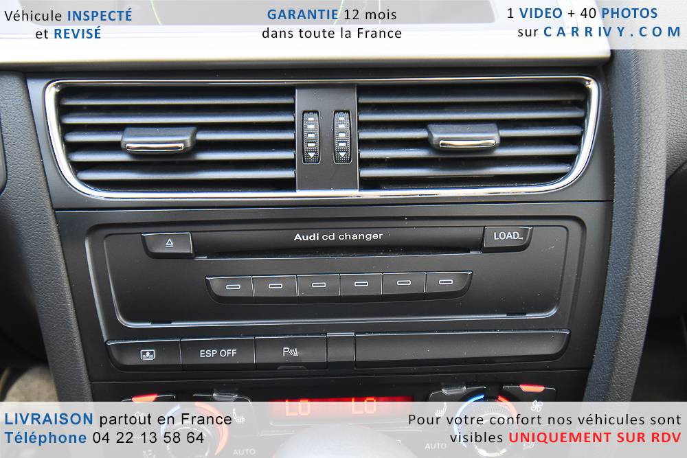 EQUIPEMENTS => Gps tv + carte sd – Kit mains libres bluetooth – Radio cd mp3 + chargeur cd – Capteur de pluie et de luminosité – Régulateur de vitesse – Jantes alu – Phares bi xénon – Radar de recul – Rétroviseurs électriques – Banquette 1/3 2/3 – Clim automatique tri zones – Direction assistée – Ordinateur de bord – Rétroviseur intérieur électrochrome – Sièges avant électriques – Verrouillage centralisé des portes – Vitres avant électriques – Volant réglable en profondeur et hauteur – Sellerie cuir – Abs – Airbags frontaux – Airbags latéraux avant – Airbags rideaux – Antipatinage – Esp – Phares antibrouillard – Démarrage sans clé : 710 € ttc – Régulateur de vitesse et de distance : 1 180 € ttc – Caméra de recul : 960 € ttc – Peinture métal : 890 € ttc – Radar de stationnement av et ar : 430 € ttc – Rétros élec. dégivrants et rabattables : 410 € ttc – Sièges avant chauffants : 380 € ttc – Sellerie cuir & alcantara : 380 € ttc – – Suivi d’entretien audi en intégralité – Première main – Interieur cuir – Sièges chauffants – Détecteur de franchissement – Front assist – Réglage électrique des sièges à mémoire : 1500 – Détecteur d’angle mort – Hifi bang & olufsen : 1500 –