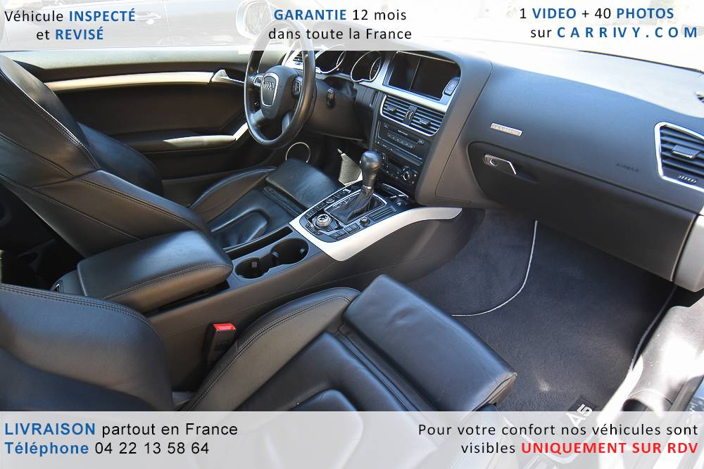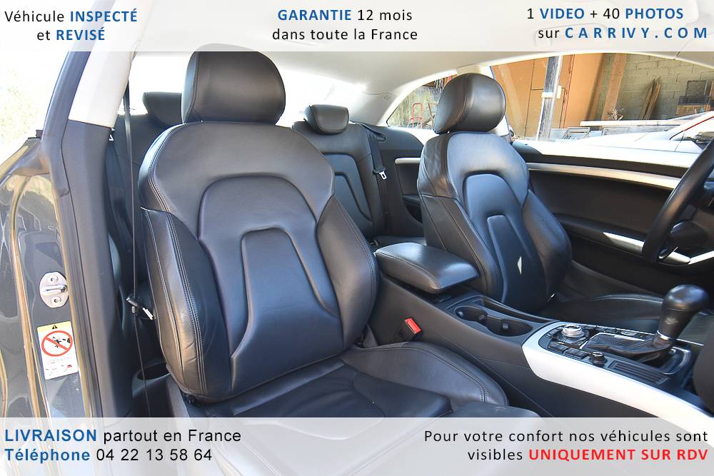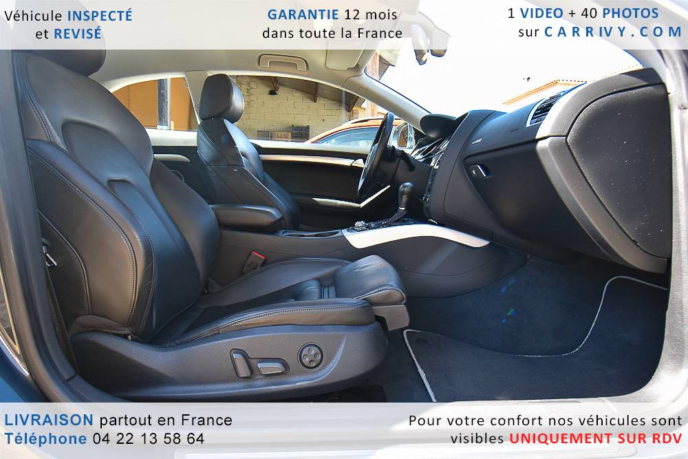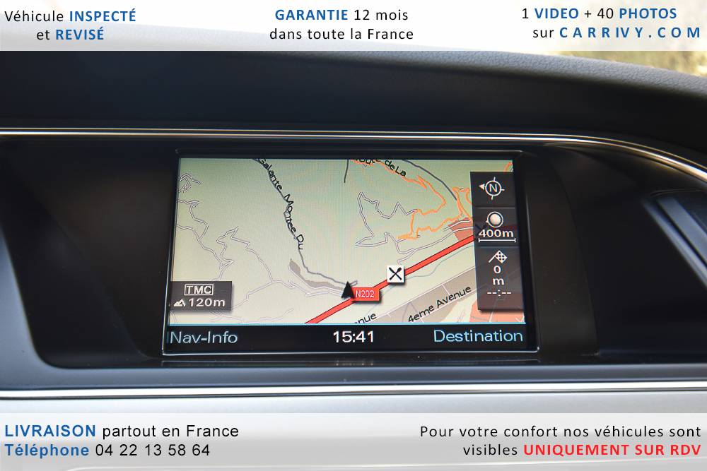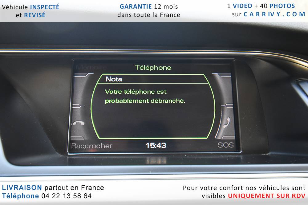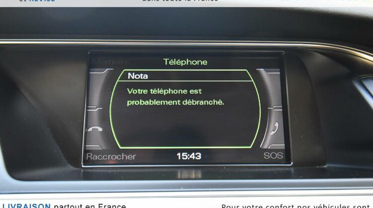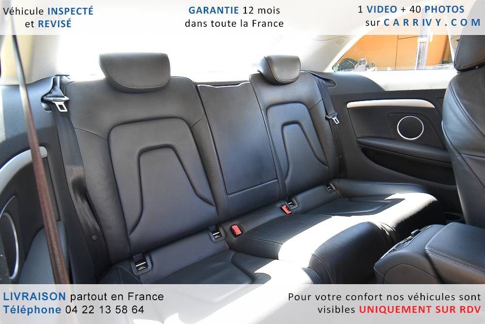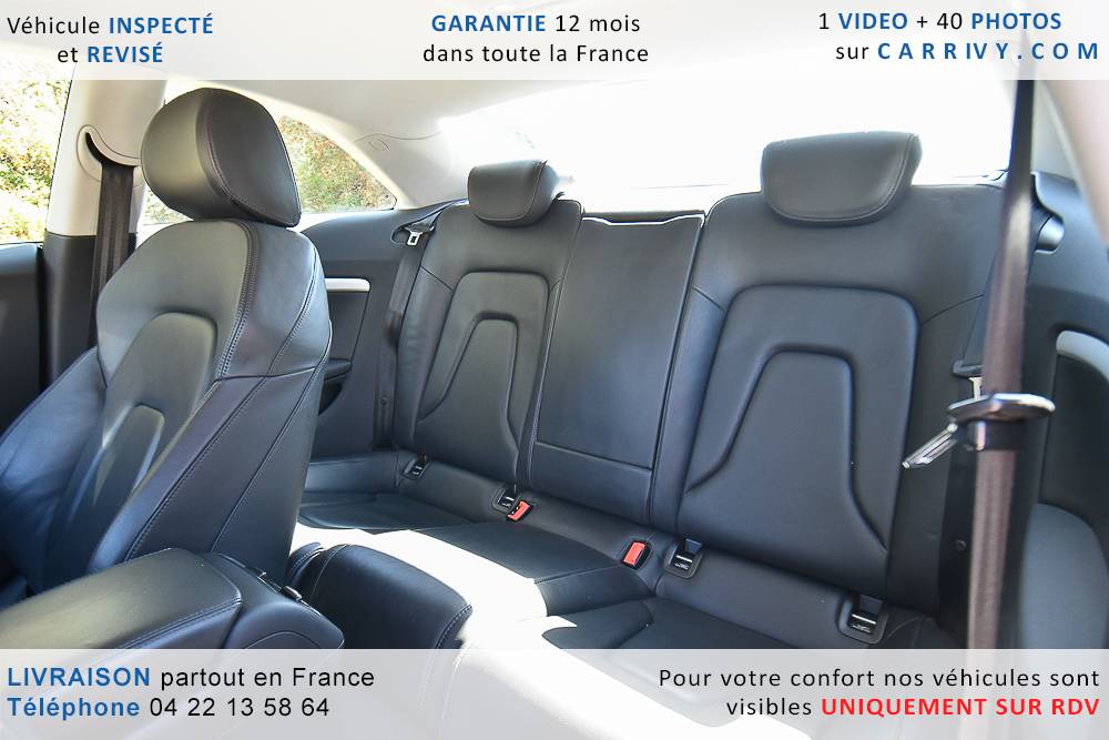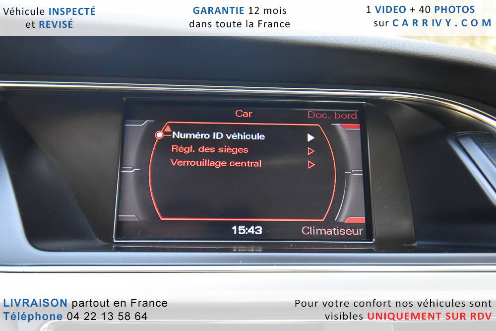 EQUIPEMENTS => Gps tv + carte sd – Kit mains libres bluetooth – Radio cd mp3 + chargeur cd – Capteur de pluie et de luminosité – Régulateur de vitesse – Jantes alu – Phares bi xénon – Radar de recul – Rétroviseurs électriques – Banquette 1/3 2/3 – Clim automatique tri zones – Direction assistée – Ordinateur de bord – Rétroviseur intérieur électrochrome – Sièges avant électriques – Verrouillage centralisé des portes – Vitres avant électriques – Volant réglable en profondeur et hauteur – Sellerie cuir – Abs – Airbags frontaux – Airbags latéraux avant – Airbags rideaux – Antipatinage – Esp – Phares antibrouillard – Démarrage sans clé : 710 € ttc – Régulateur de vitesse et de distance : 1 180 € ttc – Caméra de recul : 960 € ttc – Peinture métal : 890 € ttc – Radar de stationnement av et ar : 430 € ttc – Rétros élec. dégivrants et rabattables : 410 € ttc – Sièges avant chauffants : 380 € ttc – Sellerie cuir & alcantara : 380 € ttc – – Suivi d’entretien audi en intégralité – Première main – Interieur cuir – Sièges chauffants – Détecteur de franchissement – Front assist – Réglage électrique des sièges à mémoire : 1500 – Détecteur d’angle mort – Hifi bang & olufsen : 1500 –